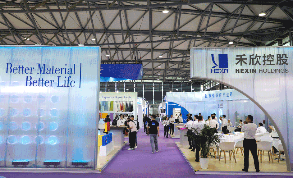 承襲一貫風格,禾欣360平米的超大展位,占據了E7館中心位置,讓新老客戶能“熟門熟路”找到禾欣展臺。今年的全新的展陳方式,也讓幾乎所有客戶驚呼“眼前一亮”“別具新意”。展示區采用“A面產業鏈展區+B面新材料創意展區”組合的方式,來詮釋“技術創新,產業協同”主題。整個展陳區以半環形舞臺形式,讓禾欣“化-布-革”全產業鏈的系列產品逐一得到展示。此外,展臺運用了輕質、透光的PC環保材料,通過燈光呈現三維色彩效果,既為展會增添一股清新的藝術氣息,又呼應了行業的可持續理念。